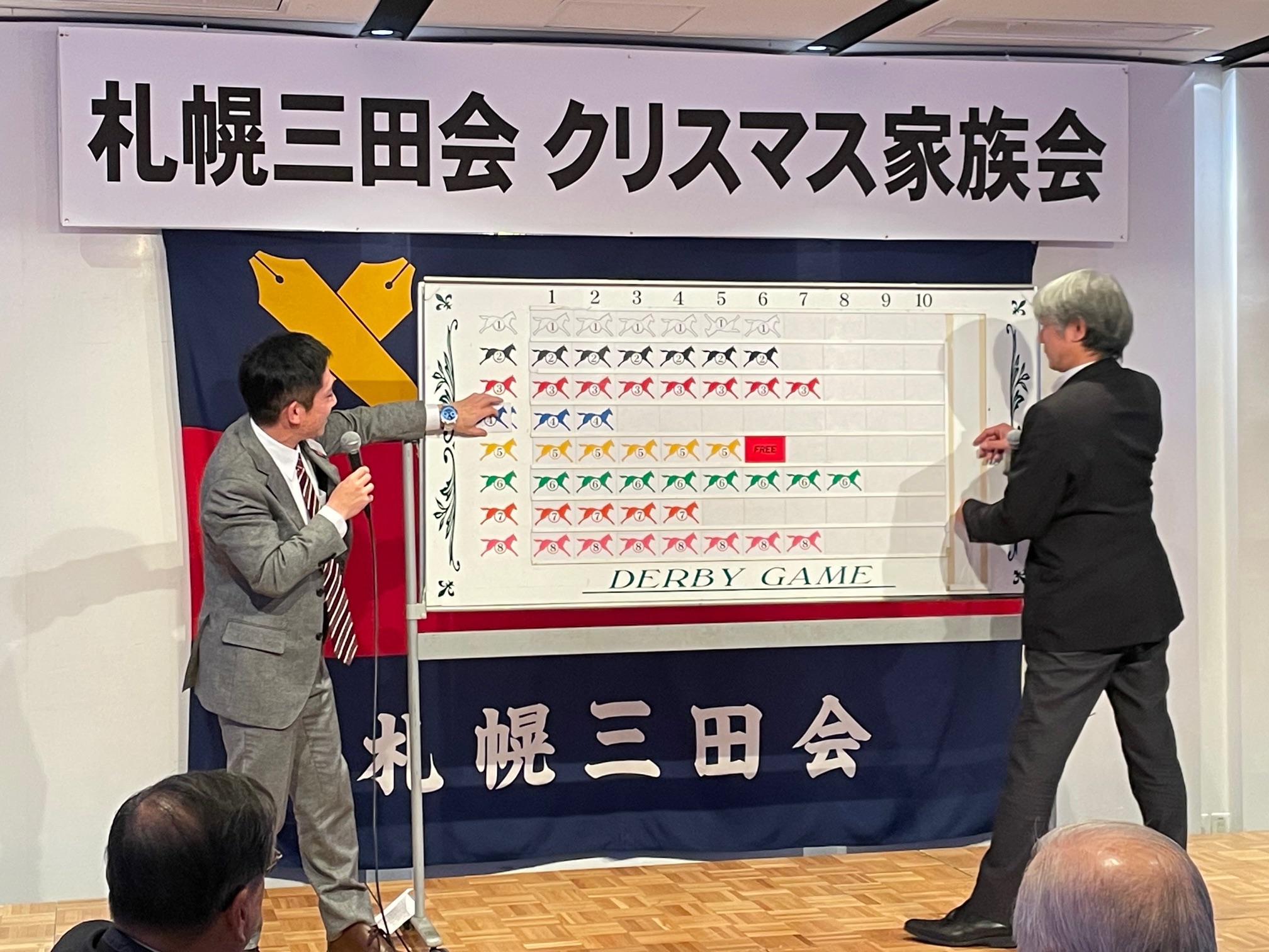懇親会では、テーブル対抗ビンゴゲーム、恒例のダービーゲーム、今井会長からお子様